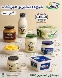 حليب طبيعى – سمن وزبدة طبيعى – جبنة قريش – جبنة فيتا – لبنة شامية- جبنة سبريد -مش بلدى- عصائر